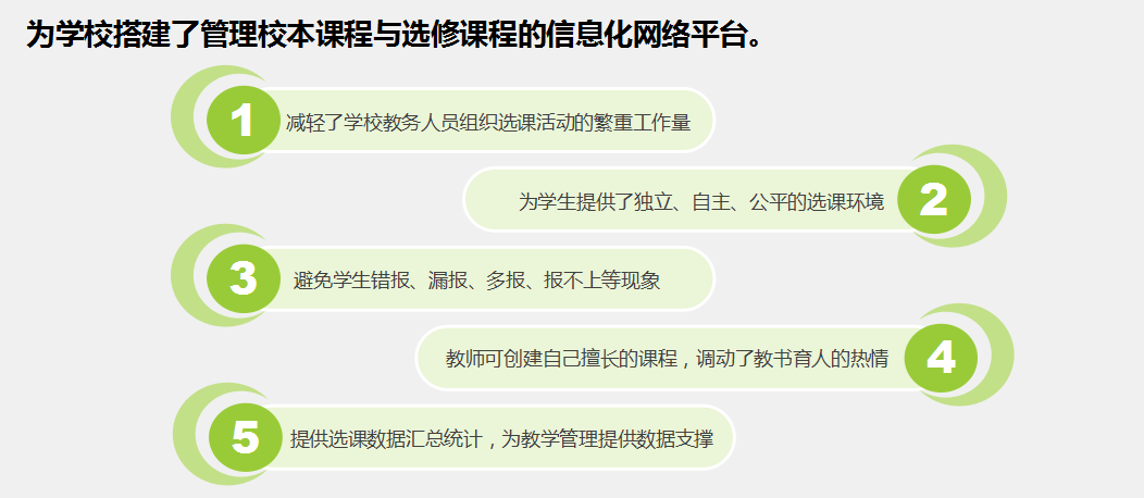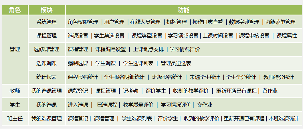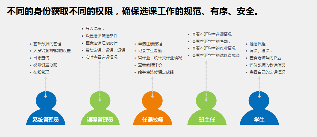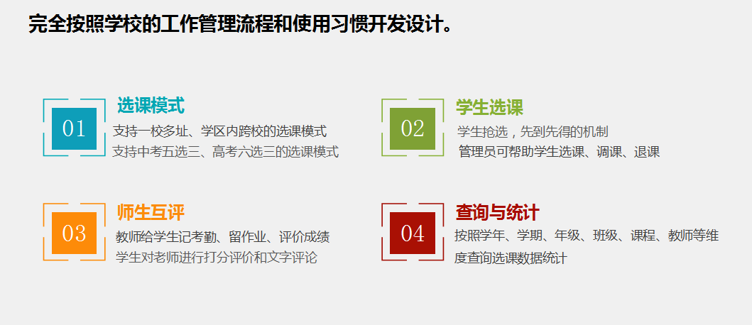 学生抢选,先到先得的机制,管理员可帮助学生选课、调课、退课。